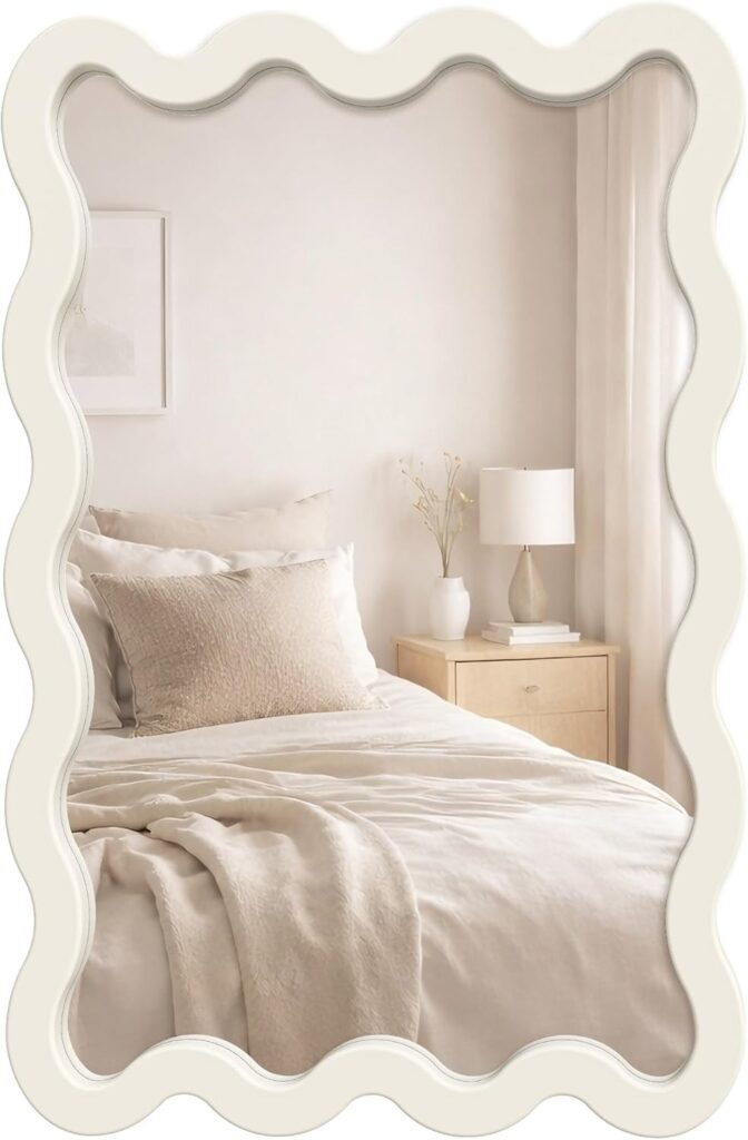 If you’re looking for a statement mirror that doubles as wall art, the Pocetry White Wavy Wall Mirror is a stunning blend of function and modern design. With its soft cream finish, sculptural squiggle shape, and solid wood frame, this asymmetrical mirror brings a dreamy, aesthetic touch to bedrooms, vanity areas, entryways, and boutique-style bathrooms.